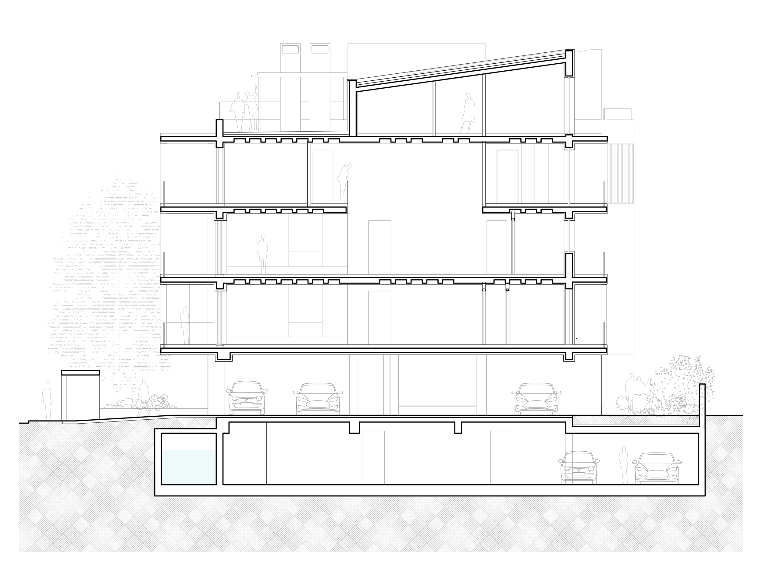 The building occupies a small footprint, allowing for generous garden areas that enhance the connection to nature. Two car lifts provide access to underground parking, eliminating the need for space-consuming car ramps and maximizing the site’s usability.